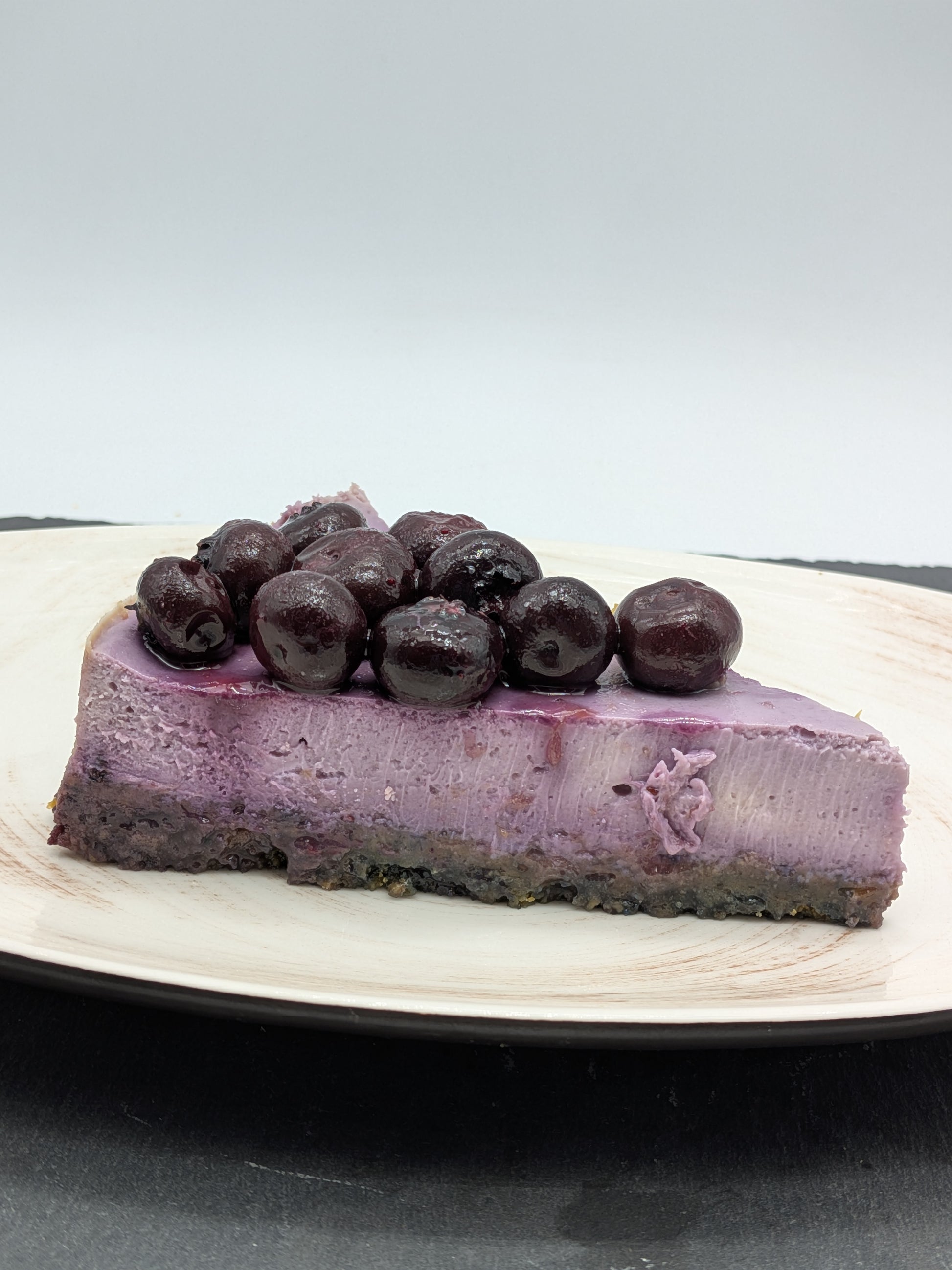 Our Blueberry Cheesecake Slice is crafted with silky smooth cream cheese infused with real blueberry purée, creating that naturally rich lavender hue. Each slice rests on a buttery Graham crust with hints of blueberry crumble — finished with a generous layer of juicy whole blueberries for a burst of freshness in every bite.